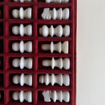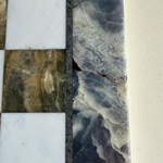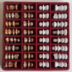 Each marble square carries gentle veining and a delicate patina — the quiet signature of authentic vintage stone. The chess pieces are beautifully preserved, their contours crisp and elegant, while the original storage box shows meaningful signs of age, revealing the passage of time without compromising function or beauty.