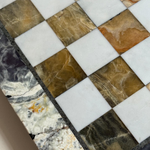 A striking expression of Italian craftsmanship, this vintage 1970s chess set hails from Tuscany, most likely hewn from the region’s renowned Carrara marble paired with luminous onyx. Its 50cm x 50cm board exudes timeless grandeur, weighing a substantial 11kg, a testament to its solid, sculptural presence.