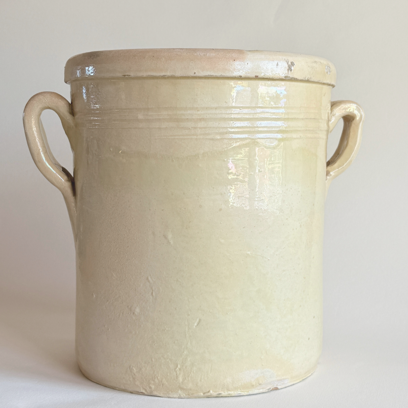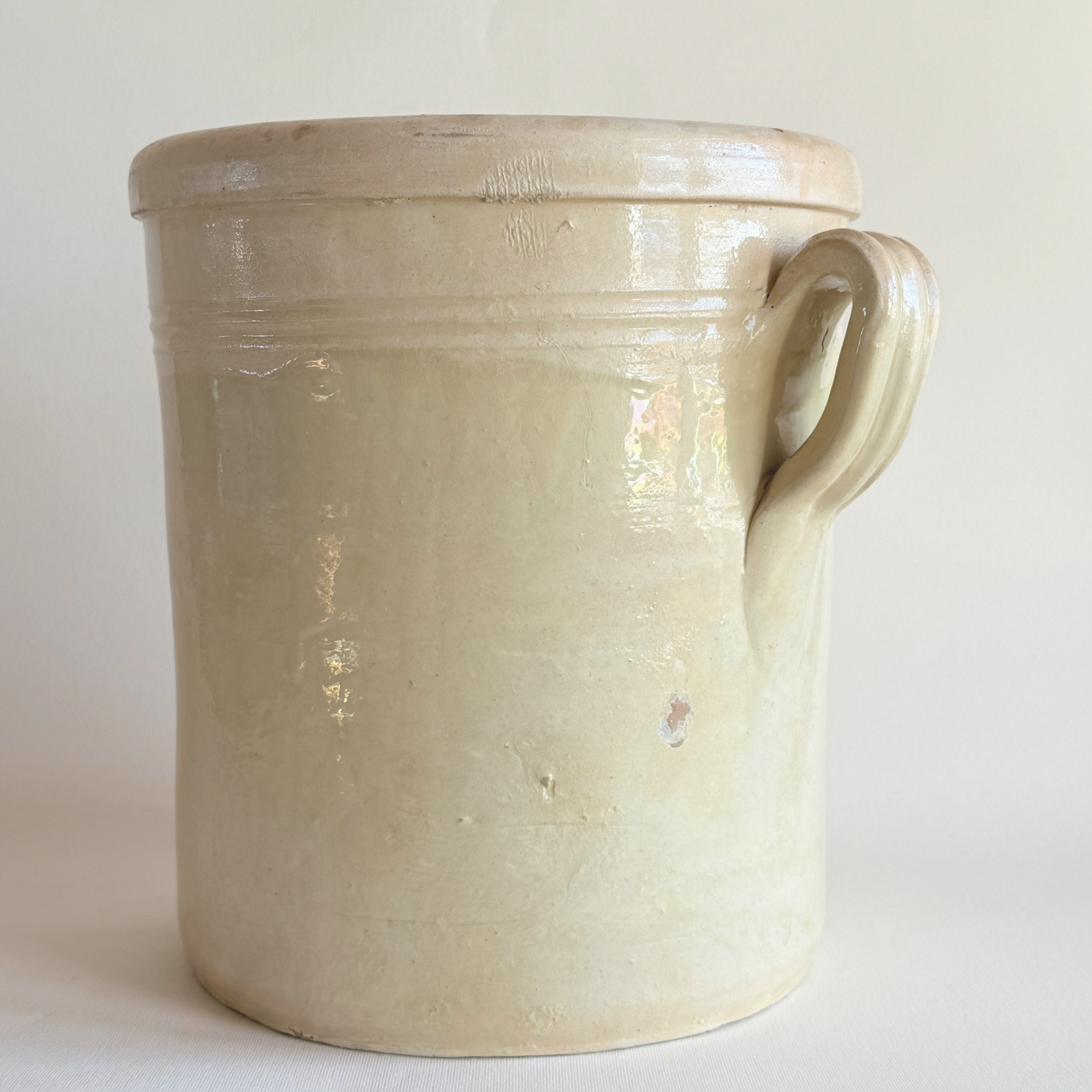 Exemple raffiné du savoir-faire italien du XIXe siècle, ce grand pot à conserves ancien en céramique incarne le luxe discret des ustensiles de cuisine traditionnels européens. Sa glaçure beige aux nuances subtiles révèle des mouvements de couleur naturels et de délicates ébréchures dues à l'âge sur le bord supérieur, témoignage authentique de son histoire. D'une généreuse capacité de 5 litres, cette pièce maîtresse se transforme avec élégance, passant de récipient de conservation pratique et traditionnel à élément décoratif raffiné dans une cuisine de luxe, un garde-manger soigneusement agencé ou un service de table design.