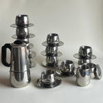 Indulge in the refined elegance of the AMC Coffee Set , a distinguished ensemble from the late 70s Art Design Collection. The set includes a sleek coffee maker, sugar bowl, cups with matching saucers, a delicate creamers, and elegant spoons. Crafted from lustrous stainless steel and polished metal, its sophisticated silver finish embodies iconic Italian design. A true collector’s piece, ideal for elevating your coffee rituals. Not suitable for induction cooktops.